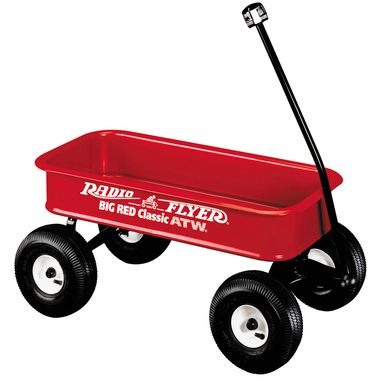 The The New Radio Flyer Big Red Classic ATW is 50% deeper than the classic red wagon and has high sides for extra capacity. Real air tires provide a soft, quiet ride, and the sturdy steel construction has no-scratch edges and a no-pinch ball joint to keep fingers safe. A controlled turning radius prevents tipping. The extra long handle makes pulling easy, and folds under for convenient storage. For ages over 1 1/2 years.