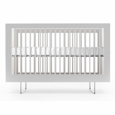 Sleek lines of the Alto Crib from Spot On Square are a beautiful sleep solution for your modern nursery. This beautiful crib in White non-toxic water based finish keeps baby safe with no moving parts and ultra smoothness everywhere. Two long sides feature wide slats spaced for baby safety while the end rails feature solid White panels that give baby a cozy secure environment. Those solid panels invite creative ideas so go for it and add baby's name and some pretty images to blend with your nursery theme. The mattress support has three positions for lowering the mattress as your child grows. The Alto design was influenced by modern architecture and brings airy translucent panels with encapsulated organic materials to create a visually stunning piece for the modern nursery. Gracefully curved chrome legs provide plenty of toe space all around the crib while the low profile allows a comfortable reach for baby from all four sides.
