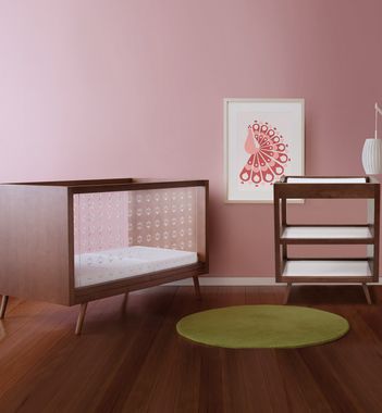 The Ubabub 2 Piece Set with the Nifty Clear Convertible Crib Collection Nifty Changer provides a beautiful bed and a changing station with unique design and safety features. These units were created by Natasha and Daniel Dumais in Australia. Baby's safety comes first and this ultra modern crib has the ideal mattress support system with 4 positions. The two upper positions are used in the initial stages when baby is less mobile. The two lower positions are used when your baby is more active with sit-ups and pull-ups. The design also includes a low profile with ergonomic comfort for you while lifting baby in and out of the crib. The crib has a unique feature of clear acrylic sides providing baby a full view. For additional air flow, the acrylic sides have very small cutouts that are attractive yet safe for little fingers. The Nifty Changer is unique with care-giver access at one end instead of the long side. It also has ergonomic proportions allowing you to stand and change diapers in a comfortable position while baby is snug and safe surrounded by the borders. It is durable and ecologically friendly with two large shelves that are open on three sides with room for dozens of diapers and all other diaper changing essentials (change pad not included). It is an ideal book shelf after the diaper phase. The set is made of eco-friendly timber and the best non-toxic finish. Junior bed conversion kit sold separately.